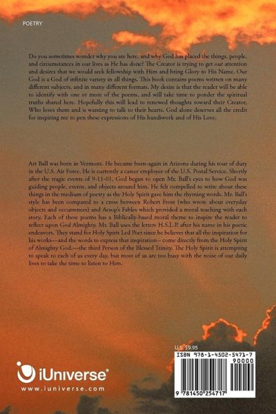 Do you sometimes wonder why you are here, and why God has placed the things, people, and circumstances in our lives as He has done? The Creator is trying to get our attention and desires that we would seek fellowship with Him and bring Glory to His Name. Our God is a God of infinite variety in all things. This book contains poems written on many different subjects, and in many different formats. My desire is that the reader will be able to identify with one or more of the poems, and will take time to ponder the spiritual truths shared here. Hopefully this will lead to renewed thoughts toward their Creator, Who loves them and is wanting to talk to their hearts. God alone deserves all the credit for inspiring me to pen these expressions of His handiwork and of His Love.