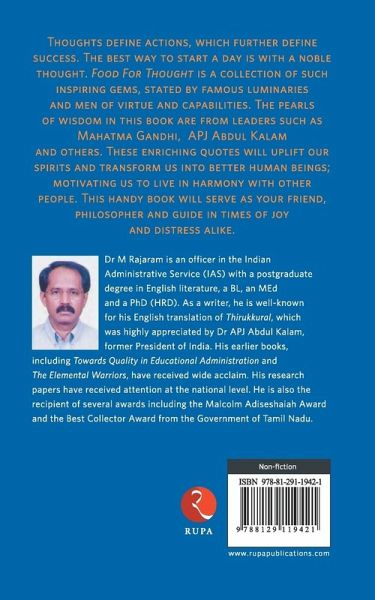 Thoughts define actions, which further define success. The best way to start a day is with a noble thought, food for thought is a collection of such inspiring gems, stated by famous luminaries and men of virtue and capabilities. The perls of wisdom in this book are from leaders such as mahatama gandhi, apj abdul kalam and others. These enriching quotes will uplift our spirits and transform us in harmony with other people. This handy book will serve as your friend, philosopher and guide in times of joy and distress alike