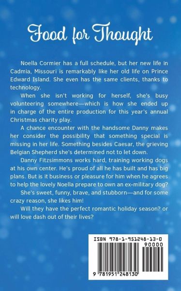 Sweet Latter-day Saint contemporary romance Noella Cormier has a full schedule, but her new life in Cadmia, Missouri is remarkably like her old life on Prince Edward Island. She even has the same clients, thanks to technology. When she isn't working for herself, she's busy volunteering somewhere-which is how she ended up in charge of the entire production for this year's annual Christmas charity play. A chance encounter with the handsome Danny makes her consider the possibility that something special is missing in her life. Something besides Caesar, the grieving Belgian Shepherd she's determined not to let down. Danny Fitzsimmons works hard, training working dogs at his own center. He's proud of all he has built and has big plans. But is it business or pleasure for him when he agrees to help the lovely Noella prepare to own an ex-military dog? She's sweet, funny, brave, and stubborn-and for some crazy reason, she likes him! Will they have the perfect romantic holiday season? or will love dash out of their lives?