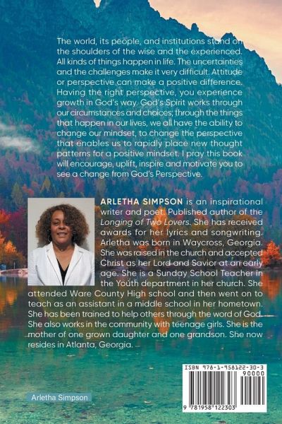 The world, its people, and institutions stand on the shoulders of the wise and the experienced. All kinds of things happen in life. The uncertainties and the challenges make it very difficult. Attitude or perspective can make a positive difference. Having the right perspective, you experience growth in God's way. God's Spirit works through our circumstances and choices; through the things that happen in our lives, we all have the ability to change our mindset, to change the perspective that enables us to rapidly place new thought patterns for a positive mindset. I pray this book will encourage, uplift, inspire and motivate you to see a change from God's Perspective.