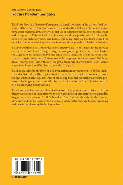 This book Food in a Planetary Emergency is a timely overview of the current food systems and the required transformations to respond to the challenges of climate change, population pressures, biodiversity loss and use of natural resources, such as soils, water and phosphorus. This book takes a planetary health perspective which explores the links between natural systems and human wellbeing implying that there is need for united actions to achieve important environmental and population health co-benefits. This book outlines that the foundation of planetary health is sustainability. It addresses environment and climate change emergency as a global agenda, however, emphasises the urgency of the sustainability perspective which integrates a wide spectrum of issues that require integrated solutions to offer better prospects for humanity. This book drives this argument further through the global Sustainable Development Goals (SDGs) where food is not just SDG2 but transcends all 17 goals. This book tackles the problems of food production and consumption at a global, industry and individual level linking it to topics related to the natural environment, climate change, waste, marketing, new ways of producing food and providing alternative proteins, mitigating non-communicable diseases, flexitarianism and the role of Generation Z in the emerging dietary choices. This book benefits readers with understanding the importance and intricacy of their dietary choices at a point in time when our planet is facing an emergency triggered by long-term dependence on fossil fuels and artificial fertilisers but also by the ways we have provided food. However, this book also delivers the message that safeguarding and sustaining planetary health is possible.