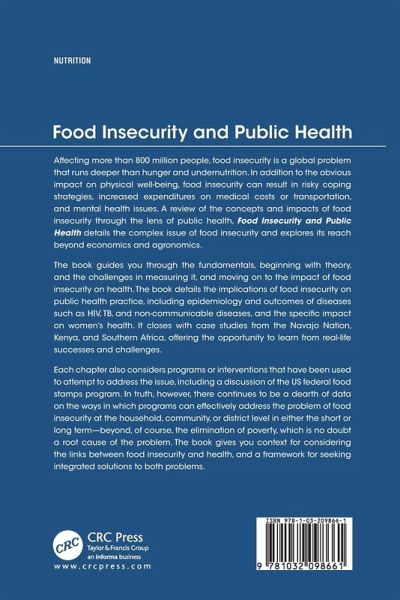 Affecting more than 800 million people, food insecurity is a global problem that runs deeper than hunger and undernutrition. In addition to the obvious impact on physical well-being, food insecurity can result in risky coping strategies, increased expenditures on medical costs or transportation, and mental health issues. A review of the concepts and impacts of food insecurity through the lens of public health, Food Insecurity and Public Health details the complex issue of food insecurity and explores its reach beyond economics and agronomics. The book guides you through the fundamentals, beginning with theory, and the challenges in measuring it, and moving on to the impact of food insecurity on health. The book details the implications of food insecurity on public health practice, including epidemiology and outcomes of diseases such as HIV, TB, and non-communicable diseases, and the specific impact on women's health. It closes with case studies from the Navajo Nation, Kenya, and Southern Africa, offering the opportunity to learn from real-life successes and challenges. Each chapter also considers programs or interventions that have been used to attempt to address the issue, including a discussion of the US federal food stamps program. In truth, however, there continues to be a dearth of data on the ways in which programs can effectively address the problem of food insecurity at the household, community, or district level in either the short or long term-beyond, of course, the elimination of poverty, which is no doubt a root cause of the problem. The book gives you context for considering the links between food insecurity and health, and a framework for seeking integrated solutions to both problems.