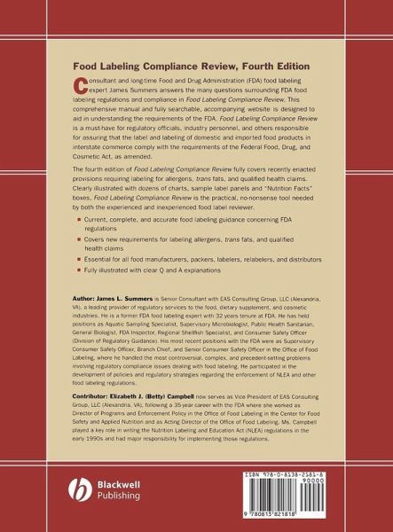 Consultant and long-time Food and Drug Administration (FDA) food labeling expert James Summers answers the many questions surrounding FDA food labeling regulations and compliance in Food Labeling Compliance Review. This comprehensive manual and fully searchable, accompanying CD-ROM are designed to aid in understanding the requirements of the FDA. Food Labeling Compliance Review is a must-have for regulatory officials, industry personnel, and others responsible for assuring that the label and labeling of domestic and imported food products in interstate commerce comply with the requirements of the Federal Food, Drug and Cosmetic Act, as amended. The new fourth edition of Food Labeling Compliance Review fully covers recently enacted provisions requiring labeling for allergens, trans fats, and qualified health claims. Clearly illustrated with dozens of charts, sample label panels and 'Nutrition Facts' boxes, Food Labeling Compliance Review is the practical, no-nonsense tool needed by both the experienced and inexperienced food label reviewer. * Current, complete, and accurate food labeling guidance concerning FDA regulations * Covers new requirements for labeling allergens, trans fats, and qualified health claims * Essential for all food manufacturers, packers, labelers, relabelers, and distributors * Fully illustrated with clear Q and A explanations * Fully-searchable CD-ROM enables quick look ups