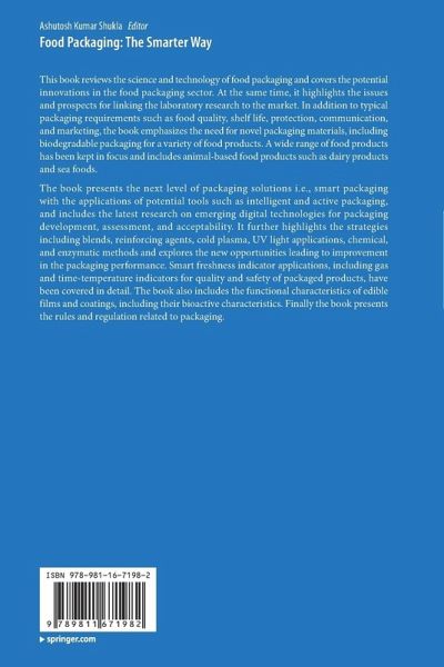 Chapter 1. Chapter 1. Food packaging industry - An introduction.- Chapter 2. Toward Smarter Food Packaging.- Chapter 3. Novel packaging development, assessment and authentication using smart technologies, non-invasive biometric sensory tools, and artificial intelligence.- Chapter 4. Biodegradable packaging materials and techniques to improve their performance.- Chapter 5. Smart Freshness Indicator for Animal Based Products Packaging - Current Status.-Chapter 6. Packaging of dairy products-Emerging strategies.- Chapter 7. Functional packaging materials for fishery products applications.- Chapter 8. Edible films and coatings: Major challenges and potential applications in food Packaging: A Review.-Chapter 9. Role of sensors to improve food/beverage packaging.- Chapter 10. Functional nanomaterials for food packaging applications.- Chapter 11. Rules and regulations related with packaging.