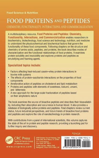 Food Proteins-Peptides: Chemistry and Structure. Food Proteins-Peptides: Determination and Characterization. Food Proteins and Peptides: Structure-Function Relationship.Protein Solubility and Functionality. Proteins-Peptides as Emulsifying Agents.Proteins and Peptides as Foaming Agents. Chemical and Enzymatic Protein Modifications and Functionality Enhancement. Heat-induced Casein-Whey Protein Interactions. Protein-Saccharide Interaction. Peptide-Lipid Interactions and Functionalities. Proteins and Peptides with Taste. Bioavailability and Safety of Food Peptides. Database of Biologically Active Proteins and Peptides. Food-Derived Bioactive Peptides in the Market. Large-scale Fractionation of Biopeptides. Industry Perspectives and Commercial Trends for Food Protein and Biopeptides. Protein Nanotechnology: Research, Development, and Precaution in the Food Industry.Index.