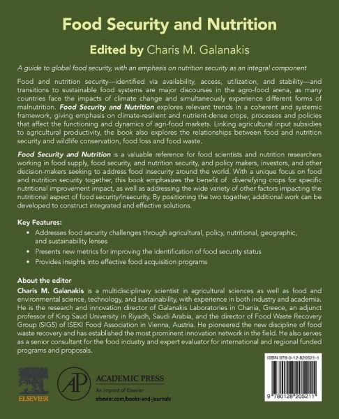 Food and nutrition security - identified via availability, access, utilization, and stability - and transitions to sustainable food systems are major discourses in the agro-food arena, as many countries today experience different forms of malnutrition simultaneously, such as child undernutrition, anemia among women, and adult obesity. Meanwhile, the triple burden of malnutrition (undernutrition, overnutrition, and micronutrient deficiency) is still widespread. Food Security and Nutrition explores integrated, context-specific approaches to food security challenges, emphasizing nutrition security as an integral component and addressing the implications of food content to food and nutrition security policies. Providing insight into these challenges through agricultural, policy, nutritional, geographic and sustainability lenses, Food Security and Nutrition is a valuable reference for food scientists and nutrition researchers working in food supply, food security, and nutrition security, and policy makers, investors, and other decision-makers seeking to address food insecurity around the world.