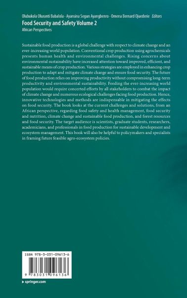 Sustainable food production is a global challenge with respect to climate change and an ever-increasing world population. Conventional crop production using agrochemicals presents human health and environmental challenges. Rising concerns about environmental sustainability have increased attention toward improved, efficient, and sustainable means of crop production. Various strategies are employed in enhancing crop production to adapt and mitigate climate change and ensure food security. The future of food production relies on improving productivity without compromising long-term productivity and environmental sustainability. Feeding the ever-increasing world population would require concerted efforts by all stakeholders to combat the impact of climate change and numerous ecological challenges facing food production. Hence, innovative technologies and methods are indispensable in mitigating the effects on food security. The book looks at the current challenges and solutions, froman African perspective, regarding food safety and health management, food security and nutrition, climate change and sustainable food production, and forest resources and food security. The target audience is scientists, graduate students, researchers, academicians, and professionals in food production for sustainable development and ecosystem management. This book will also be helpful to policymakers and specialists in framing future feasible agro-ecosystem policies.