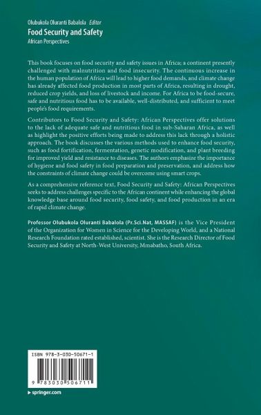 1. Harnessing the Hidden Treasures in African Yam Bean (Sphenostylis stenocarpa), An Underutilized Grain Legume with Food Security Potentials.- 2. The Role of Indigenous Food Species in Achieving Food Security in South-Eastern Nigeria.- 3. The potentials of African neglected and orphan crops in augmentation of African food security.- 4. Optimization of Soaking Condition and Drying Temperature for The Production of African Yam Beans (Sphenostylis sternocarpa) Flour.- 5. Harnessing the Potential of Underutilized Aquatic Bioresource For Food and Nutritional Security in Kenya.- 6. Exploring Some Neglected and Underutilized Root and Tuber Crops for Food Security in Nigeria.- 7. Finger Millet: A Crop with Food Security Potentials for Africans.- 8. An Exploratory Study of The Association Among Household Food Securing Activities, Gender and Health in South Africa.- 9. Exploring the Industrial Potential of The Nigerian Pumpkins (Cucurbita pepo L.).- 10. Functional Meat andMeat Products for Sustainable African Nutrition Security.- 11. Agricultural Productivity: A Key Component of Inclusive Growth Towards Food Security.- 12. Optimal Formulation of a Composite Flour from Biofortified Cassava, Pigeonpea, and Soybean for Complementary Feeding.- 13. Gauging Food Insecurity Resilience Among Pastoral Communities: A Case Study of Kenya.- 14. Optimisation and Multiplication of Large Fulani Eco-Type Chicken for Sustainable Production and Genetic Security in Nigeria.- 15. Soil Quality Indicators; Their correlation and Role in Enhancing Agricultural Productivity.- 16. Soil Quality and Horticulture: Implication for Food Security and Safety in Nigeria.- 17. Beneficiation of castor and thorn trees as management strategy to food security.- 18. Soil Information as A Factor to Consider in Sustainable Tree Crop Production for Nutritional Security, Poverty Alleviation and Biodiversity Management in Africa.- 19. African Walnuts: A Natural Depository of Nutritional and Bioactive Compounds Essential for Food and Nutritional Security in Africa.- 20. Implications of Production, Post-harvest and Consumption of Fish on Food and Nutrition Security: Nigeria as a Focal Country.- 21. Improving Crop Physio-Biochemical Efficiency and Abiotic Resilient Crops for Alleviating Food Insecurity in Africa.- 22. Analysis of Cassava Farmers' Response to Climate Change Adaptation: Implication for Sustainable Food Production in Nigeria.- 23. Sustainable Agriculture: A Way Out to Combat Food Insecurity and Unsafety in The Context of Climate Change in West Africa.- 24. Smart Crops for Climate Change and Food Security in Africa.- 25. Impact of Climate Change and Climate Variability on Food Safety and Occurrence of Foodborne Diseases.- 26. Management of Soil-Microorganism: Interphase for Sustainable Soil Fertility Management and Enhanced Food Security.- 27. The Relevance of Plant Breeding to Food Security in Africa.- 28. Extent, Impact and Prospects of Genetically Engineered Cropsin Africa.- 29. Soil Microbes and Food Security Nexus: Imperativeness of Microbial Biotechnology.- 30. Production of Edible Oil from Microorganisms.- 31. Food Sustainability Enhancement: Plant Growth-Promoting Bacteria as Key Players in The Alleviation of Drought Stress in Plants.- 32. Molecular Markers: Potential Facilitators in Plant Breeding and Germplasm Conservation.- 33. Biofertilizer: An Eco-Friendly Approach for Sustainable Crop Production.- 34. Design and Development of a Hybrid Bio-Solar Energy Fruit Dryer.- 35. Advances in Extrusion Technology and Its Applicability to Food Processing in Developing Nations.- 36. Nanotechnology as Vehicle for Biocontrol of Plant Diseases in Crop Production.- 37. Fusarium Species and Their Associated Mycotoxins in Foods and Their Products In Africa.- 38. Application of Nanobiotechnology In Agri-Food Sector; A Promising Technique in Food Safety.- 39. Salmonella enterica Subspecies Enterica Serotypes Associated with Meat and Meat Products in African Countries: A Review.- 40. Heavy Metals Contamination of Arable Lands: A Threat to Food Security and Safety.- 41. A Step Forward Towards Food Safety from Parasite Infective Agents.- 42. African Fermented Food as Antimicrobial Agents.- 43. Risk Assessment of Human Carcinogenicity of Acrylamide in Food: Way to Reduce the Predicted Mitogenic Side Effects Through Mitigation Strategy.- 44. Safety Hazards Along Animal Food Supply Chain in Nigeria.