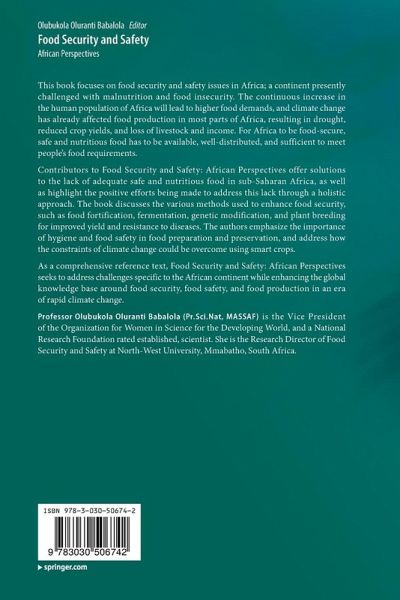 1. Harnessing the Hidden Treasures in African Yam Bean (Sphenostylis stenocarpa), An Underutilized Grain Legume with Food Security Potentials.- 2. The Role of Indigenous Food Species in Achieving Food Security in South-Eastern Nigeria.- 3. The potentials of African neglected and orphan crops in augmentation of African food security.- 4. Optimization of Soaking Condition and Drying Temperature for The Production of African Yam Beans (Sphenostylis sternocarpa) Flour.- 5. Harnessing the Potential of Underutilized Aquatic Bioresource For Food and Nutritional Security in Kenya.- 6. Exploring Some Neglected and Underutilized Root and Tuber Crops for Food Security in Nigeria.- 7. Finger Millet: A Crop with Food Security Potentials for Africans.- 8. An Exploratory Study of The Association Among Household Food Securing Activities, Gender and Health in South Africa.- 9. Exploring the Industrial Potential of The Nigerian Pumpkins (Cucurbita pepo L.).- 10. Functional Meat andMeat Products for Sustainable African Nutrition Security.- 11. Agricultural Productivity: A Key Component of Inclusive Growth Towards Food Security.- 12. Optimal Formulation of a Composite Flour from Biofortified Cassava, Pigeonpea, and Soybean for Complementary Feeding.- 13. Gauging Food Insecurity Resilience Among Pastoral Communities: A Case Study of Kenya.- 14. Optimisation and Multiplication of Large Fulani Eco-Type Chicken for Sustainable Production and Genetic Security in Nigeria.- 15. Soil Quality Indicators; Their correlation and Role in Enhancing Agricultural Productivity.- 16. Soil Quality and Horticulture: Implication for Food Security and Safety in Nigeria.- 17. Beneficiation of castor and thorn trees as management strategy to food security.- 18. Soil Information as A Factor to Consider in Sustainable Tree Crop Production for Nutritional Security, Poverty Alleviation and Biodiversity Management in Africa.- 19. African Walnuts: A Natural Depository of Nutritional and Bioactive Compounds Essential for Food and Nutritional Security in Africa.- 20. Implications of Production, Post-harvest and Consumption of Fish on Food and Nutrition Security: Nigeria as a Focal Country.- 21. Improving Crop Physio-Biochemical Efficiency and Abiotic Resilient Crops for Alleviating Food Insecurity in Africa.- 22. Analysis of Cassava Farmers' Response to Climate Change Adaptation: Implication for Sustainable Food Production in Nigeria.- 23. Sustainable Agriculture: A Way Out to Combat Food Insecurity and Unsafety in The Context of Climate Change in West Africa.- 24. Smart Crops for Climate Change and Food Security in Africa.- 25. Impact of Climate Change and Climate Variability on Food Safety and Occurrence of Foodborne Diseases.- 26. Management of Soil-Microorganism: Interphase for Sustainable Soil Fertility Management and Enhanced Food Security.- 27. The Relevance of Plant Breeding to Food Security in Africa.- 28. Extent, Impact and Prospects of Genetically Engineered Cropsin Africa.- 29. Soil Microbes and Food Security Nexus: Imperativeness of Microbial Biotechnology.- 30. Production of Edible Oil from Microorganisms.- 31. Food Sustainability Enhancement: Plant Growth-Promoting Bacteria as Key Players in The Alleviation of Drought Stress in Plants.- 32. Molecular Markers: Potential Facilitators in Plant Breeding and Germplasm Conservation.- 33. Biofertilizer: An Eco-Friendly Approach for Sustainable Crop Production.- 34. Design and Development of a Hybrid Bio-Solar Energy Fruit Dryer.- 35. Advances in Extrusion Technology and Its Applicability to Food Processing in Developing Nations.- 36. Nanotechnology as Vehicle for Biocontrol of Plant Diseases in Crop Production.- 37. Fusarium Species and Their Associated Mycotoxins in Foods and Their Products In Africa.- 38. Application of Nanobiotechnology In Agri-Food Sector; A Promising Technique in Food Safety.- 39. Salmonella enterica Subspecies Enterica Serotypes Associated with Meat and Meat Products in African Countries: A Review.- 40. Heavy Metals Contamination of Arable Lands: A Threat to Food Security and Safety.- 41. A Step Forward Towards Food Safety from Parasite Infective Agents.- 42. African Fermented Food as Antimicrobial Agents.- 43. Risk Assessment of Human Carcinogenicity of Acrylamide in Food: Way to Reduce the Predicted Mitogenic Side Effects Through Mitigation Strategy.- 44. Safety Hazards Along Animal Food Supply Chain in Nigeria.