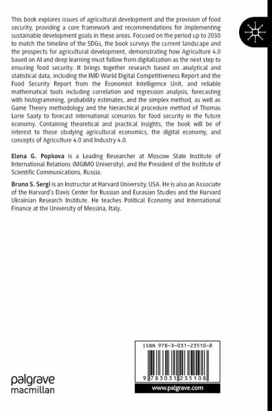 This book explores issues of agricultural development and the provision of food security, providing a core framework and recommendations for implementing sustainable development goals in these areas. Focused on the period up to 2030 to match the timeline of the SDGs, the book surveys the current landscape and the prospects for agricultural development, demonstrating how Agriculture 4.0 based on AI and deep learning must follow from digitalization as the next step to ensuring food security. It brings together research based on analytical and statistical data, including the IMD World Digital Competitiveness Report and the Food Security Report from the Economist Intelligence Unit, and reliable mathematical tools including correlation and regression analysis, forecasting with histogramming, probability estimates, and the simplex method, as well as Game Theory methodology and the hierarchical procedure method of Thomas Lorie Saaty to forecast international scenarios for food security inthe future economy. Containing theoretical and practical insights, the book will be of interest to those studying agricultural economics, the digital economy, and concepts of Agriculture 4.0 and Industry 4.0.