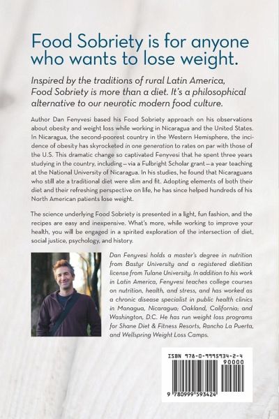 Food Sobriety is for anyone who wants to lose weight. Inspired by the traditions of rural Latin America, Food Sobriety is more than a diet. It's a philosophical alternative to our neurotic modern food culture. The Food Sobriety approach was developed by author Dan Fenyvesi over years of working with weight loss in both the United States and Nicaragua. The second-poorest country in the Western Hemisphere, Nicaragua has in one generation seen its incidence of obesity skyrocket to rates on par with those of the United States. This dramatic change so captivated Fenyvesi that he spent three years studying in the country, including - via a Fulbright Scholar grant - a year teaching at the National University of Nicaragua. In his studies, he found that Nicaraguans who still ate a traditional diet were slim and fit. Adopting elements of both their diet and their refreshing perspective on life, he has since helped hundreds of his North American patients lose weight. The science underlying Food Sobriety is presented in a light, fun fashion, and the recipes are easy and inexpensive. What's more, while working to improve your health, you will be engaged in a spirited exploration of the intersection of diet, social justice, psychology, and history. Click https://www.youtube.com/watch?v=xo3MekuduMw to see the author's 15 min dual language documentary on one Nicaraguan family's struggle with obesity.