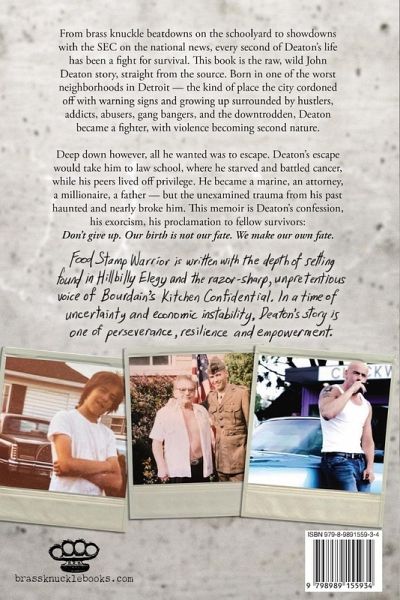 JOHN DEATON'S RAW AND COMPELLING MEMOIR From brass knuckle beatdowns on the schoolyard to showdowns with the SEC on the national news, every second of Deaton's life has been a fight for survival. This book is the raw, wild John Deaton story, straight from the source. Born in one of the worst neighborhoods in Detroit - the kind of place the city cordoned off with warning signs and growing up surrounded by hustlers, addicts, abusers, gang bangers, and the downtrodden, Deaton became a fighter, with violence becoming second nature. Deep down however, all he wanted was to escape. Deaton's escape would take him to law school, where he starved and battled cancer, while his peers lived off privilege. He became a marine, an attorney, a millionaire, a father - but the unexamined trauma from his past haunted and nearly broke him. This memoir is Deaton's confession, his exorcism, his proclamation to fellow survivors: Don't give up. Our birth is not our fate. We make our own fate. Food Stamp Warrior is written with the depth of setting found in Hillbilly Elegy and the razor-sharp, unpretentious voice of Bourdain's Kitchen Confidential. In a time of uncertainty and economic instability, Deaton's story is one of perseverance, resilience and empowerment.