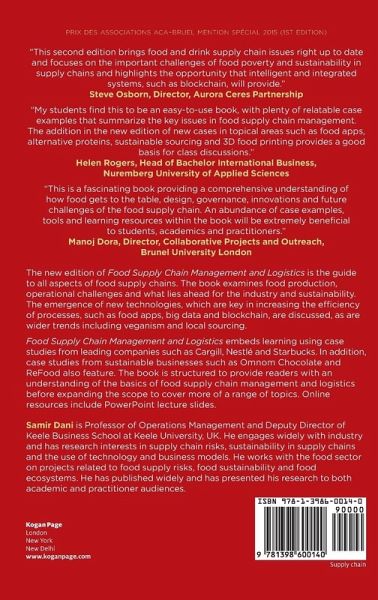 First edition WINNER: ACA-Bruel 2015 - Prix des Associations Food supply chains are integral in ensuring that food makes it from the farm to the table. Understanding how these operate has never been more important. The new edition of Food Supply Chain Management and Logistics is the guide to all aspects of food supply chains. This book examines food production, operational challenges and the future challenges of the industry and sustainability. The emergence of new technologies, which are key in increasing the efficiency of processes, such as food apps, big data and blockchain, are discussed. As are wider trends including veganism and local sourcing. Food Supply Chain Management and Logistics embeds learning using case studies from leading companies such as Cargill, Nestlé and Starbucks. In addition, case studies from sustainable businesses such as Omnom Chocolate and ReFood also feature. The book is structured to provide readers with an understanding of the basics of food supply chain management and logistics before expanding the scope to cover more of a range of topics. Online resources include PowerPoint lecture slides.
