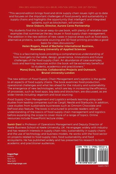 Chapter 01: Introduction to food supply chains; Section ONE: Food production; Chapter 02: Food production; Chapter 03: Food manufacturing; Section TWO: Operational challenges; Chapter 04: Food retailing; Chapter 05: Food logistics; Chapter 06: Challenges in international food supply chains; Chapter 07: Collaboration and relationships; Chapter 08: Food sourcing and procurement; Chapter 09: Risk management; Chapter 10: Technology trends in food supply chains; Section THREE: Sustainability and future challenges; Chapter 11: Food regulation, safety and quality; Chapter 12: Food innovation; Chapter 13: Sustainability challenges in food supply chains; Chapter 14: Food sector and economic regeneration; Chapter 15: Food security and future challenges