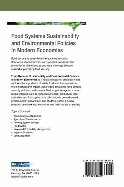 Food security is essential to the advancement and development of economies and societies worldwide. The promotion of viable food structures is the most effective method of promoting food security. Food Systems Sustainability and Environmental Policies in Modern Economies is a relevant research publication that explores the importance of viable food structures as well as the critical positive impact these viable structures have on food security, nutrition, and poverty. Featuring coverage on a broad range of topics such as irrigation schemes, agricultural input subsidies, and food cycles, this publication is geared toward professionals, researchers, and students seeking current research on viable food structures and their impact on society.