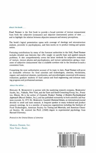 Food Texture is the first book to provide a broad overview of texture measurementfrom both the subjective (consumer) and objective (instrument) points of viewand to highlight the relation between objective measures and sensory perceptions