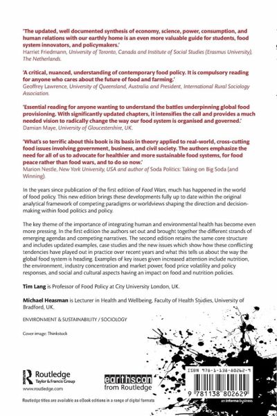Tim Lang is Professor of Food Policy at City University London, UK. He has been a consultant to UN agencies, including auditing the Global Top 25 Food Companies on food and health for the WHO. He was a UK Sustainable Development Commissioner, 2006-11, and has worked closely with civil society organisations locally, nationally and internationally. In 2010 he was appointed to the Mayor of London's Food Board. He is a frequent commentator on food policy in the media. Michael Heasman is Lecturer in Health and Wellbeing, Faculty of Health Studies, University of Bradford, UK. He has held academic positions at universities including Alberta, Aalborg, SOAS, Reading and Harper Adams. He is Research Fellow at the Centre for Food Policy, City University London. He has been a consultant to Agriculture & Agri-Food Canada, VTT in Finland and CSIRO in Australia.