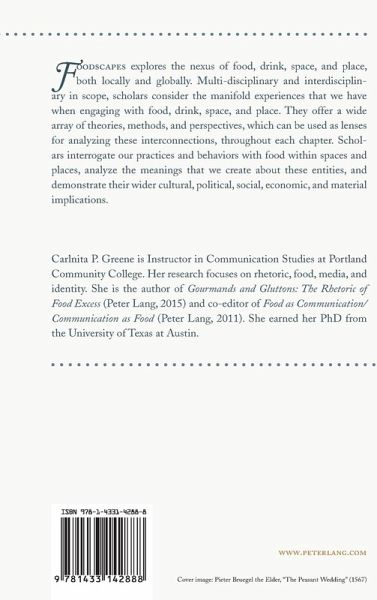 Carlnita P. Greene: Introduction: Mapping the Contemporary Foodscape-Intersections Between Food, Space and Place - June Brawner: "You Can Taste It in the Wine": Terroir and the Embodiment of Place - Kathryn E. Sampeck: Chocolate, Place, and Space: Cacao Terroir and Pre-Columbian to Early Modern Political Geographies - Ryan S. Eanes: The Restaurant: A Perfect Collision of Public and Private? - Michael Pennell: Music to Our Mouths: Ambiance, Place, and Flavor in Modern Dining - Michael S. Bruner/Elizabeth Phillips: Food at School - Melanija Belaj/Jelena Ivanisevic: The Contemporary Allure of a Food Market: An Ethnographic Study of Dolac Market - Christine Hippert: "Put It on My Tab": Dominican-Haitian Relations and Buying Food on Credit in Neighborhood Corner Stores - Ross Singer: Agrarian Myth, Public Memory, and the Industrial Food Narrative of American Family Farming at Iowa's Living History Farms Open-Air Museum - Courtney Thorsson: Kitchen, Nation, Diaspora: Ntozake Shange's African American Foodways - Zachary Hecht: #London Vegans - Leda Cooks: Bodies, Places and Spaces for Food Taste and Waste - Irina Gendelman/Jeff Birkenstein: Teaching Travel through Wandering and Food - David Szanto: Touring Taste and Place: A Performance of Tongues, Terroir, and Taters - Contributors - Index.