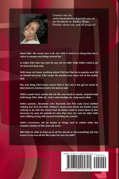 Meet Faith. Her name says it all...her Faith in God is so strong that she is naive to people and things around her. In walks Clint who has had his eye set on Faith while Faith's mind is set on God and God only. Faith does not know anything about Clint but that he is popular and full of himself because Clint keeps his promiscuous ways out of the public eye. The only thing Clint knows about Faith is that she is the girl he wants to take home to momma and to his bed as well. Faith's cousin Toya comes into her life and wants to quote, unquote help Faith keep Clint. After all....that's what families do...help each other. Faith's parents....Reverend John Reynolds and First Lady have instilled nothing but God into,their children's hearts and minds but Daniel wants nothing to do with the church that his father wants to hand down to him because he sees his parents for who they truly are and his sister Faith sees nothing wrong with anyone including her parents.
