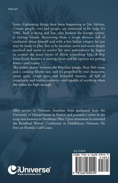 Some frightening things have been happening to Jim Salvino. Certain people, very bad people, are interested in his help. It's 1985. Steel is dying and Jim, who brokers the foreign variety, is visiting Miami. Recovering from a rough divorce, full of confusion about himself and with a hot Italian temper, he just may be ready to play. But as he becomes more and more deeply involved and starts to resolve his own ambivalence he begins to unravel the many layers of deceit enmeshing him. A ship from South America is moving closer and his options are getting fewer-and scarier. The action moves between the Brazilian jungle, Rust Belt snow and a cooking Miami sun, and it's propelled by real characters: smart guys, tough guys and beautiful women, all full of complexity and hidden motives-and capable of anything when the stakes are high enough.