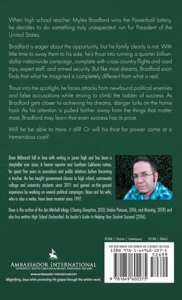 What an unexpected delight. The concept is fresh and original, the writing solid, the story - well, I'm still smiling. Thomas Locke, Bestselling Author When high school teacher Myles Bradford wins the Powerball lottery, he decides to do something truly unexpected: run for President of the United States. Bradford is eager about the opportunity, but his family clearly is not. With little time to sway them to his side, he's thrust into running a quarter-billion-dollar nationwide campaign, complete with cross-country flights and road trips, expert staff, and armed security. But like most dreams, Bradford soon finds that what he imagined is completely different from what is real. Thrust into the spotlight, he faces attacks from newfound political enemies and false accusations while striving to climb the ladder of success. As Bradford gets closer to achieving his dreams, danger lurks on the home front. As his attention is pulled farther away from the things that matter most, Bradford may learn that even success has its price. Will he be able to have it all? Or will his thirst for power come at a tremendous cost?