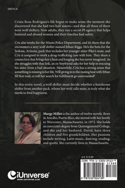 Crista Rosa Rodriguez's life began to make sense the moment she discovered that she had two half sisters-and that all three of them were wolf shifters. Now adults, they run a secret PI agency that helps battered and abused women and their families find safety. Cris also works for the Miami Police Department, and it's there that she encounters a sexy wolf shifter named Ethan Riggs. He's the beta for the Sedona, Arizona, pack that includes her younger sister Pilar's mate, and Cris is assigned to work a drug-trafficking case with him. They share a connection that brings her a heat and longing she has never imagined. As she struggles with that link, an ex-boyfriend asks for her help in rescuing his sister from a bad situation. Meanwhile, Cris has a strong sense that something is missing in her life. Will giving in to the mating heat with Ethan fill that void, or will her search for fulfillment go unrewarded? In this erotic novel, a wolf shifter must decide whether a handsome shifter from another pack, whom her wolf calls mate, is truly what she needs to find happiness.