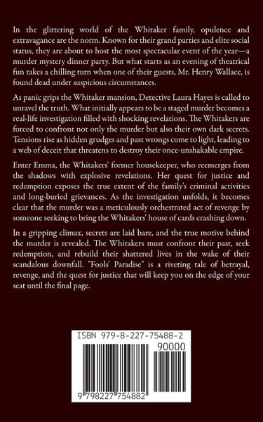 In the glittering world of the Whitaker family, opulence and extravagance are the norm. Known for their grand parties and elite social status, they are about to host the most spectacular event of the year-a murder mystery dinner party. But what starts as an evening of theatrical fun takes a chilling turn when one of their guests, Mr. Henry Wallace, is found dead under suspicious circumstances. As panic grips the Whitaker mansion, Detective Laura Hayes is called to unravel the truth. What initially appears to be a staged murder becomes a real-life investigation filled with shocking revelations. The Whitakers are forced to confront not only the murder but also their own dark secrets. Tensions rise as hidden grudges and past wrongs come to light, leading to a web of deceit that threatens to destroy their once-unshakable empire. Enter Emma, the Whitakers' former housekeeper, who reemerges from the shadows with explosive revelations. Her quest for justice and redemption exposes the true extent of the family's criminal activities and long-buried grievances. As the investigation unfolds, it becomes clear that the murder was a meticulously orchestrated act of revenge by someone seeking to bring the Whitakers' house of cards crashing down. In a gripping climax, secrets are laid bare, and the true motive behind the murder is revealed. The Whitakers must confront their past, seek redemption, and rebuild their shattered lives in the wake of their scandalous downfall. "Fools' Paradise" is a riveting tale of betrayal, revenge, and the quest for justice that will keep you on the edge of your seat until the final page.