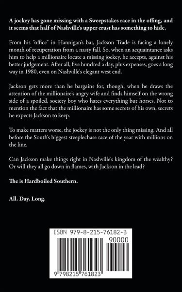 A jockey has gone missing with a Sweepstakes race in the offing, and it seems that half of Nashville's upper crust has something to hide. From his "office" in Hannigan's bar, Jackson Trade is facing a lonely month of recuperation from a nasty fall. So, when an acquaintance asks him to help a millionaire locate a missing jockey, he accepts, against his better judgement. After all, five hundred a day, plus expenses, goes a long way in 1980, even on Nashville's elegant west end. Jackson gets more than he bargains for, though, when he draws the attention of the millionaire's angry wife and finds himself on the wrong side of a spoiled, society boy who hates everything but horses. Not to mention the fact that the millionaire has some secrets of his own, secrets he expects Jackson to keep. To make matters worse, the jockey is not the only thing missing. And all before the South's biggest steeplechase race of the year with millions on the line. Can Jackson make things right in Nashville's kingdom of the wealthy? Or will they all go down in flames, with Jackson in the lead? The is Hardboiled Southern. All. Day. Long.