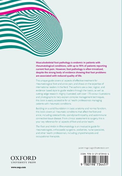 Musculoskeletal foot pathology is endemic in patients with rheumatological conditions, with up to 90% of patients reporting current foot pain. However, foot pathology is often trivialised, despite the strong body of evidence showing foot problems are associated with reduced quality of life. The Foot and Ankle in Rheumatology is a unique, comprehensive, and detailed guide to all aspects of the management of foot and ankle pathologies in rheumatic conditions. Written by a team of leading experts, this title provides international perspectives and current state of the art information on foot and ankle pathology across a range of conditions. With over 170 colour images and photographs, practical diagnostic and management techniques are clearly explained with references to the latest guidelines. Rheumatology is a fast-evolving field, with major advances in treatment and management strategies. As the effective management of rheumatological foot and ankle disorders requires and integrated, disease-stage approach across a multidisciplinary team, the Foot and Ankle in Rheumatology has been designed to provide clear, practical, and evidence-based advice for a wide range of health professions, from podiatrists, rheumatologists, and orthopaedic surgeons to occupational therapists and physiotherapists.
