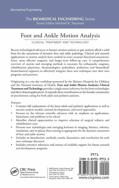 Human motion analysis or gait analysis is used throughout the country and the world in clinics for pre-surgical planning and postsurgical follow-up. Only recently have technological advances truly begun to meet medical needs by supplying more accurate analytical data from which to make educated assessments of dynamic foot and ankle pathology. A comprehensive overview of current and emerging methods is necessary for practitioners to effectively integrate the new techniques into better pre-treatment planning, surgical and rehabilitative care, and post-treatment follow-up. Originating as a one-day workshop sponsored by the Shriner's Hospitals and the National Institutes of Health, Foot and Ankle Motion Analysis: Clinical Treatment and Technology provides a single source reference for the latest technologies and their clinical applications. With contributions from an international panel of experts from orthopaedic, rehabilitation, engineering, academic, medical-industrial, and clinical disciplines, this text focuses on the relevant scientific advances with an emphasis on applications, limitations, and problems to be solved. Divided into two parts, the text begins by presenting basic and advanced clinical applications and opportunities in foot and ankle motion analysis in both pediatric and adult cases. The second part introduces the technological advances themselves from a quantitative perspective. Modeling concepts, seminal developments, and novel approaches are described along with emerging horizons related to mechanical paradigms, imaging, kinetics, robotics and simulation, tri-planar force sensing, and more. The book also includes a chapter of references and sources of support for future research and development prospects. Clinical and research applications in motion analysis have resulted in better functional assessment, fewer, more effective surgeries, and longer-term follow-up care. Foot and Ankle Motion Analysis: Clinical Treatment and Tech