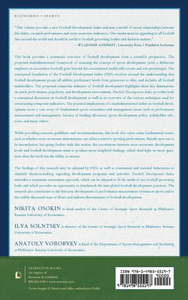 Acknowledgments Abbreviations Introduction Chapter 1: Conceptualization of Football Development Chapter 2: Overview of Multidimensional Indexes and Rankings Chapter 3: Football Development Index: Dimensions and Indicators Chapter 4: Calculation Model Chapter 5: Football Development Report 2013 Chapter 6: Dependence between Football Rankings and Socio-Economic Indicators Conclusion Appendix A: "On-Pitch Performance" Dimension Results Appendix B: "Popularity" Dimensions Results Appendix C: "Environment" Dimensions Results Appendix D: Football Development Index Results Appendix E: Continental Self-Organizing Maps of FDI Values Bibliography About the Authors