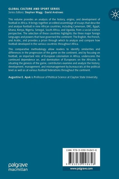 This volume provides an analysis of the history, origins, and development of football in Africa. It brings together an edited assemblage of essays that describe and analyse football in nine African countries, including Cameroon, DRC, Egypt, Ghana, Kenya, Nigeria, Senegal, South Africa, and Uganda, from a social science perspective. The selection of these countries highlights the three major foreign languages and powers that have governed the continent; The English, the French, and Arabic, and provides a prism through which to analyze and compare how football developed in the various countries throughout Africa.