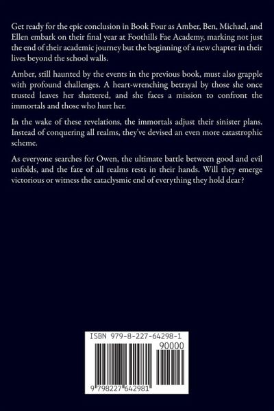 Disclaimer: This book offers a diverse range of perspectives and is quite lengthy. If you enjoy multiple viewpoints and don't mind a longer read, you may enjoy it. However, if you lean towards shorter, more succinct narratives with fewer perspectives, this might not align with your preferences. Although this is the fourth book, it can be read without reading the first three. Get ready for the epic conclusion in Book Four as Amber, Ben, Michael, and Ellen embark on their final year at Foothills Fae Academy, marking not just the end of their academic journey but the beginning of a new chapter in their lives beyond the school walls. Amber, still haunted by the events in the previous book, must also grapple with profound challenges. A heart-wrenching betrayal by those she once trusted leaves her shattered, and she faces a mission to confront the immortals and those who hurt her. In the wake of these revelations, the immortals adjust their sinister plans. Instead of conquering all realms, they've devised an even more catastrophic scheme. As everyone searches for Owen, the ultimate battle between good and evil unfolds, and the fate of all realms rests in their hands. Will they emerge victorious or witness the cataclysmic end of everything they hold dear?