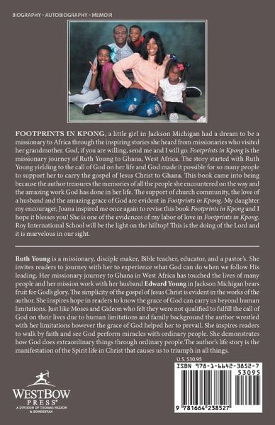 Footprints in Kpong, a little girl in Jackson Michigan had a dream to be a missionary to Africa through the inspiring stories she heard from missionaries who visited her grandmother. God, if you are willing, send me and I will go. Footprints in Kpong is the missionary journey of Ruth Young to Ghana, West Africa. The story started with Ruth Young yielding to the call of God on her life and God made it possible for so many people to support her to carry the gospel of Jesus Christ to Ghana. This book came into being because the author treasures the memories of all the people she encountered on the way and the amazing work God has done in her life. The support of church community, the love of a husband and the amazing grace of God are evident in Footprints in Kpong. My daughter my encourager, Joana inspired me once again to revise this book Footprints in Kpong and I hope it blesses you! She is one of the evidences of my labor of love in Footprints in Kpong. Roy International School will be the light on the hilltop! This is the doing of the Lord and it is marvelous in our sight.
