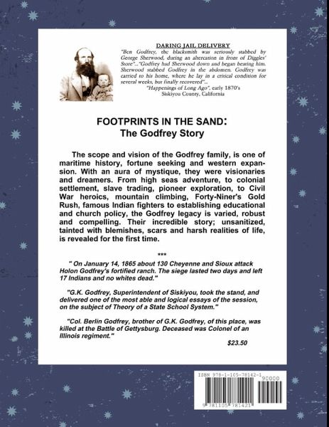 Follow the electrifying footprints of my family through 400 years of American history. The scope and vision of the Godfrey family, is one of maritime history, fortune seeking and western expansion. With an aura of mystique, they were visionaries and dreamers. From high seas adventure, to colonial settlement, slave trading, pioneer exploration, to Civil War heroics, mountain climbing, Forty-Niner's Gold Rush, famous Indian fighters to establishing educational and church policy, the Godfrey legacy is varied, robust and compelling. Their incredible story; unsanitized, tainted with blemishes, scars and harsh realities of life, is revealed for the first time. This book may appeal to family researchers, genealogists, historical societies and libraries.