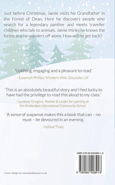Ten-year-old Jamie goes to spend the Christmas holidays with his grandfather - his Grancher Pete - in the beautiful and atmospheric Forest of Dean, while his mother goes on a short trip to Paris. Grancher Pete has a new hobby, collecting evidence of an elusive black panther which supposedly lives deep in the forest, and he takes Jamie with him to search for clues. He also introduces Jamie to a traveller family who live in a nearby camp, and Jamie makes friends with their children, Caro, Finn and Molly. The children show Jamie their huge forest playground and he is intrigued by their alternative outlook on life, which includes learning the 'old ways' from their grandmother and talking to animals in strange and ancient tongues. Jamie's holiday seems perfect when he wakes up to discover that a heavy snowfall has covered the land, and he sets off alone for a snowy play date with his new friends. While he thought he knew the forest well, the landscape looks completely different and he soon becomes lost among the trees. To top it all, Jamie unwittingly puts himself in terrible danger when he accidentally walks into the path of the panther. The legendary animal is real after all, but a more immediate problem is that no-one knows where Jamie is. As the panther creeps towards him, how will anyone be able to find him in time? Children and adults alike will be drawn into Jamie's holiday adventure, and join him in discovering that there are special moments in our lives, when 'unreality' steps into our everyday world to lend us a helping hand.