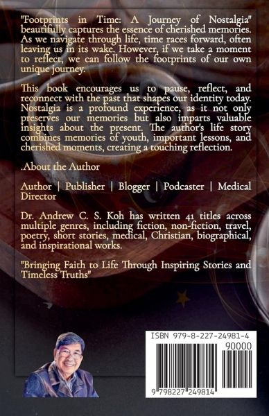 Footprints in Time is a beautifully crafted journey through the landscapes of memory, nostalgia, and the fleeting nature of time. In this deeply reflective narrative, the author invites readers to explore the moments that shape our lives, the people who leave lasting impressions, and the places that hold pieces of our hearts. Each chapter serves as a window into the past, offering glimpses of cherished memories, forgotten dreams, and the quiet beauty of moments once lived but never truly gone. With lyrical prose and poignant insights, Footprints in Time weaves together personal stories with universal themes, creating a tapestry of human experience that resonates with anyone who has ever looked back with a mix of longing, gratitude, and introspection. Through the lens of nostalgia, the book explores how time, both fleeting and eternal, imprints itself on our souls, leaving behind footprints that guide us forward even as we remember where we've been. At its core, Footprints in Time is a meditation on the passage of life, the connections we form, and the indelible marks left by the moments that matter most. Whether revisiting childhood memories, reflecting on lost loves, or contemplating the wisdom gained through years of living, this book offers readers the chance to reconnect with their own pasts and rediscover the powerful emotions that time has not erased. It's a celebration of the stories that live on within us, long after the moments have passed.