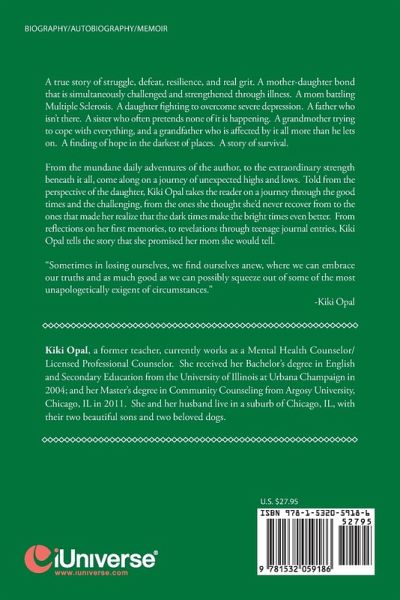 From an early age, author Kiki Opal faced a host of challenges. Her single mom battling multiple sclerosis and later dying. A father who isn't there. Opal herself fighting to overcome depression. A sister who often pretends none of it is happening. A grandmother trying to cope with it all, and a grandfather who is affected by it all more than he lets on. In Footprints of Mud, Opal shares her journey through the good times and the challenging, to the ones she thought she'd never recover from to the ones that made her realize that the dark times make the bright times brighter. From reflections on her first memories, to revelations through teenage journal entries, to letters from her mother, Opal narrates the story she promised her mom she would tell. Footprints of Mud chronicles a journey of sickness, health, depression, and finding your way.