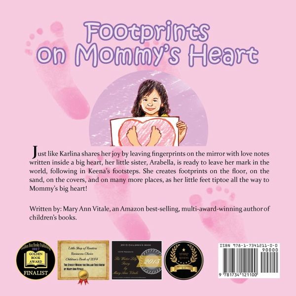 Just like Karlina shares her joy by leaving fingerprints on the mirror with love notes written inside a big heart, her little sister, Arabella, is ready to leave her mark in the world, following in Keena's footsteps. She creates footprints on the floor, on the sand, on the covers, and on many more places, as her little feet tiptoe all the way to Mommy's big heart!