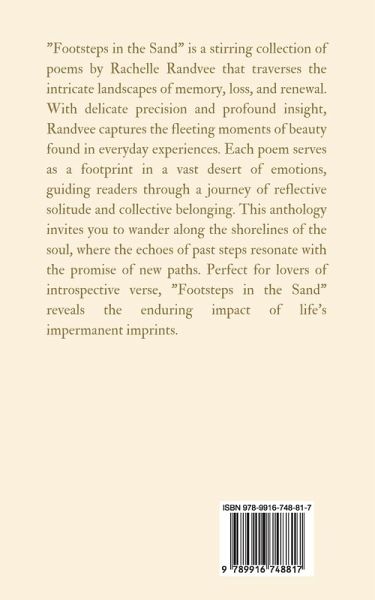 "Footsteps in the Sand" is a stirring collection of poems by Rachelle Randvee that traverses the intricate landscapes of memory, loss, and renewal. With delicate precision and profound insight, Randvee captures the fleeting moments of beauty found in everyday experiences. Each poem serves as a footprint in a vast desert of emotions, guiding readers through a journey of reflective solitude and collective belonging. This anthology invites you to wander along the shorelines of the soul, where the echoes of past steps resonate with the promise of new paths. Perfect for lovers of introspective verse, "Footsteps in the Sand" reveals the enduring impact of life's impermanent imprints. Copyright © 2024 Book Fairy Publishing