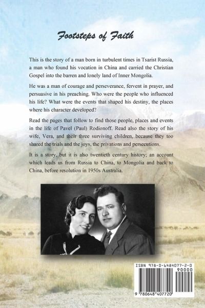 This is the story of a man born in turbulent times in Tsarist Russia, a man who found his vocation in China and carried the Christian Gospel into the barren and lonely land of Inner Mongolia. He was a man of courage and perseverance, fervent in prayer, and persuasive in his preaching. Who were the people who influenced his life? What were the events that shaped his destiny, the places where his character developed? Read the pages that follow to find those people, places and events in the life of Pavel (Paul) Rodionoff. Read also the story of his wife, Vera, and their three surviving children, because they too shared the trials and the joys, the privations and persecutions. It is a story, but it is also twentieth century history; an account which leads us from Russia to China, to Mongolia and back to China, before resolution in 1950s Australia.