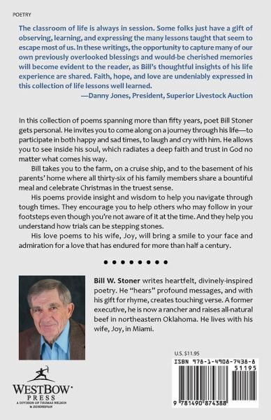 The classroom of life is always in session. Some folks just have a gift of observing, learning, and expressing the many lessons taught that seem to escape most of us. In these writings, the opportunity to capture many of our own previously overlooked blessings and would-be cherished memories will become evident to the reader, as Bill's thoughtful insights of his life experience are shared. Faith, hope, and love are undeniably expressed in this collection of life lessons well learned. -Danny Jones, President, Superior Livestock Auction In this collection of poems spanning more than fifty years, poet Bill Stoner gets personal. He invites you to come along on a journey through his life-to participate in both happy and sad times, to laugh and cry with him. He allows you to see inside his soul, which radiates a deep faith and trust in God no matter what comes his way. Bill takes you to the farm, on a cruise ship, and to the basement of his parents' home where all thirty-six of his family members share a bountiful meal and celebrate Christmas in the truest sense. His poems provide insight and wisdom to help you navigate through tough times. They encourage you to help others who may follow in your footsteps even though you're not aware of it at the time. And they help you understand how trials can be stepping stones. His love poems to his wife, Joy, will bring a smile to your face and admiration for a love that has endured for more than half a century.