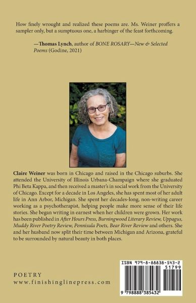 Claire Weiner was born in Chicago and raised in the Chicago suburbs. She attended the University of Illinois Urbana-Champaign where she graduated Phi Beta Kappa, and then received a master's in social work from the University of Chicago. Except for a decade in Los Angeles, she has spent most of her adult life in Ann Arbor, Michigan. She spent her decades-long, non-writing career working as a psychotherapist, helping people make more sense of their life stories. She began writing in earnest when her children were grown. Her work has been published in After Hours Press, Burningwood Literary Review, Uppagus, Muddy River Poetry Review, Pennisula Poets, Bear River Review and others. She and her husband now split their time between Michigan and Arizona, grateful to be surrounded by natural beauty in both places.