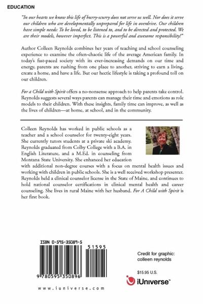 'In our hearts we know this life of hurry-scurry does not serve us well. Nor does it serve our children who are developmentally unprepared for life in overdrive. Our children have simple needs: To be loved, to be listened to, and to be directed and protected. We are their models, however imperfect. This is a powerful and awesome responsibility!" Author Colleen Reynolds combines her years of teaching and school counseling experience to examine the often-chaotic life of the average American family. In today's fast-paced society with its ever-increasing demands on our time and energy, parents are rushing from one place to another, striving to earn a living, create a home, and have a life. But our hectic lifestyle is taking a profound toll on our children. For a Child with Spirit offers a no-nonsense approach to help parents take control. Reynolds suggests several ways parents can manage their time and emotions as role models to their children. With these insights, family time can improve, as well as the lives of children-at home, at school, and in the community.