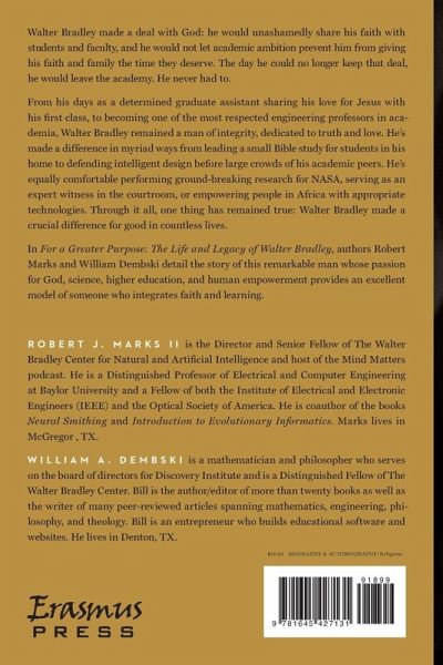 Walter Bradley made a deal with God: he would unashamedly share his faith with students and faculty, and he would not let academic ambition prevent him from giving his faith and family the time they deserve. The day he could no longer keep that deal, he would leave the academy. He never had to. From his days as a determined graduate assistant sharing his love for Jesus with his first class, to becoming one of the most respected engineering professors in academia, Walter Bradley remained a man of integrity, dedicated to truth and love. He's made a difference in myriad ways from leading a small Bible study for students in his home to defending intelligent design before large crowds of his academic peers. He's equally comfortable performing ground-breaking research for NASA, serving as an expert witness in the courtroom, or empowering people in Africa with appropriate technologies. Through it all, one thing has remained true: Walter Bradley made a crucial difference for good in countless lives. In For a Greater Purpose: The Life and Legacy of Walter Bradley, authors Robert Marks and William Dembski detail the story of this remarkable man whose passion for God, science, higher education, and human empowerment provides an excellent model of someone who integrates faith and learning.
