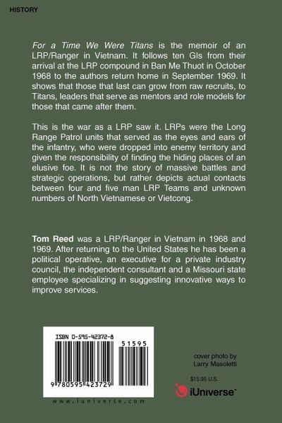 For a Time We Were Titans is the memoir of an LRP/Ranger in Vietnam. It follows ten GIs from their arrival at the LRP compound in Ban Me Thuot in October 1968 to the authors return home in September 1969. It shows that those that last can grow from raw recruits, to Titans, leaders that serve as mentors and role models for those that came after them. This is the war as a LRP saw it. LRPs were the Long Range Patrol units that served as the eyes and ears of the infantry, who were dropped into enemy territory and given the responsibility of finding the hiding places of an elusive foe. It is not the story of massive battles and strategic operations, but rather depicts actual contacts between four and five man LRP Teams and unknown numbers of North Vietnamese or Vietcong.