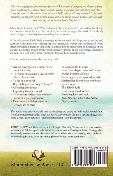 Was that a tugging sensation near my right ovary? Was it more of a tugging or a sharper, jabbing pain? Could that be ovulation? Did I miss the window or calculate incorrectly this month? Or is it implantation? Is the embryo trying to attach itself right at this very moment? Is that even something you can feel? Am I the first woman ever to be able to feel that because I love this baby more than any person has ever loved a baby before? When should I start a family? Why do I want to become a mother? How will my life change after having a baby? It's easy for questions like these to plague the mind of an already multi-tasking woman who just wants to shop for cute onesies. In For All Maternity, Emily Pardy encourages readers to ask the hard questions while humorously sharing her own tumultuous journey into motherhood. From sitting awkwardly in marriage counseling to learning how to breast-pump in the middle of the workday, this bumpy road to motherhood encounters lessons about body image, boundaries, and belief in a God who is more trustworthy than any baby manual around. Includes practical and witty advice on subjects like: · Are we ready to start a family? · The value of creating a Value System for our household · To tell or not to tell · Boy, oh boy, is that body a'changin'! · Choosing a birth plan · Expecting the unexpected · The Unicorn Effect-the celebrity status of a pregnant woman · Determining which postpartum feelings are normal · To work or not to work · How friendships change and mom-friends become a lifeline · Never neglect your spiritual growth · Making friends with your new body: a Jesus view · The Selfish Scale · How real is social media? · Parenthood-the ultimate voyage! · Remembering What's-His-Name: Dating Again! Pardy will have you laughing and crying as she makes crystal clear from her own experience that when you have a baby you give birth to a new marriage, a new home design, a new schedule-and last but not least-new friendships.