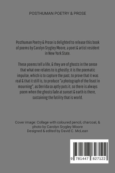 Posthuman Poetry & Prose is delighted to release this book of poems by Carolyn Srygley Moore, a poet & artist resident in New York State. These poems tell a life, & they are of ghosts in the sense that what one relates to is ghostly; it is the poematic impulse, which is to capture the past, to prove that it was real & that it still is, to produce "a photograph of the feast in mourning", as Derrida so aptly puts it, so there is always poem when the ghosts fade at sunset & earth is there, sustaining the futility that is world.