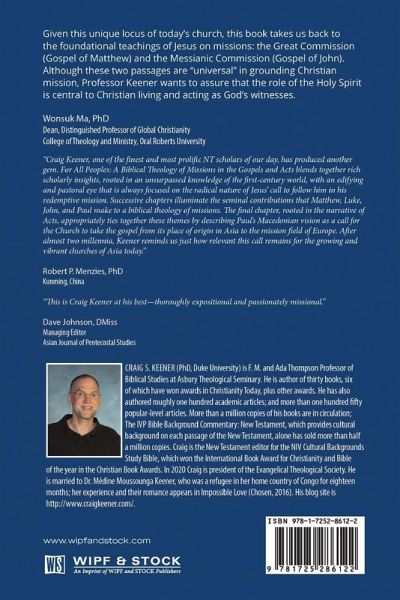 Given this unique locus of today's church, this book takes us back to the foundational teachings of Jesus on missions: the Great Commission (Gospel of Matthew) and the Messianic Commission (Gospel of John). Although these two passages are "universal" in grounding Christian mission, Professor Keener wants to assure that the role of the Holy Spirit is central to Christian living and acting as God's witnesses. Wonsuk Ma, PhD Dean, Distinguished Professor of Global Christianity College of Theology and Ministry, Oral Roberts University "Craig Keener, one of the finest and most prolific NT scholars of our day, has produced another gem. For All Peoples: A Biblical Theology of Missions in the Gospels and Acts blends together rich scholarly insights, rooted in an unsurpassed knowledge of the first-century world, with an edifying and pastoral eye that is always focused on the radical nature of Jesus' call to follow him in his redemptive mission. Successive chapters illuminate the seminal contributions that Matthew, Luke, John, and Paul make to a biblical theology of missions. The final chapter, rooted in the narrative of Acts, appropriately ties together these themes by describing Paul's Macedonian vision as a call for the Church to take the gospel from its place of origin in Asia to the mission field of Europe. After almost two millennia, Keener reminds us just how relevant this call remains for the growing and vibrant churches of Asia today." Robert P. Menzies, PhD Kunming, China "This is Craig Keener at his best--thoroughly expositional and passionately missional." Dave Johnson, DMiss Managing Editor Asian Journal of Pentecostal Studies