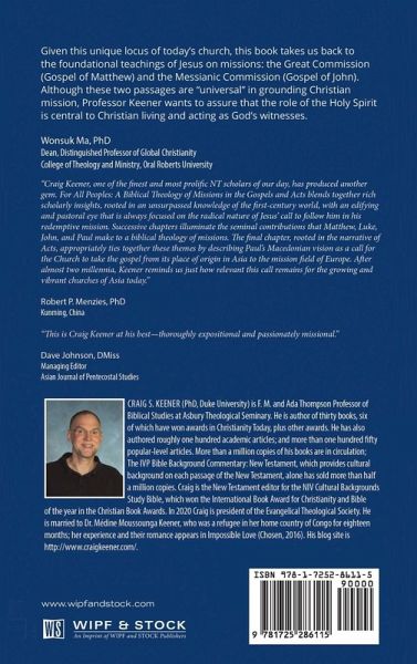 Given this unique locus of today's church, this book takes us back to the foundational teachings of Jesus on missions: the Great Commission (Gospel of Matthew) and the Messianic Commission (Gospel of John). Although these two passages are "universal" in grounding Christian mission, Professor Keener wants to assure that the role of the Holy Spirit is central to Christian living and acting as God's witnesses. Wonsuk Ma, PhD Dean, Distinguished Professor of Global Christianity College of Theology and Ministry, Oral Roberts University "Craig Keener, one of the finest and most prolific NT scholars of our day, has produced another gem. For All Peoples: A Biblical Theology of Missions in the Gospels and Acts blends together rich scholarly insights, rooted in an unsurpassed knowledge of the first-century world, with an edifying and pastoral eye that is always focused on the radical nature of Jesus' call to follow him in his redemptive mission. Successive chapters illuminate the seminal contributions that Matthew, Luke, John, and Paul make to a biblical theology of missions. The final chapter, rooted in the narrative of Acts, appropriately ties together these themes by describing Paul's Macedonian vision as a call for the Church to take the gospel from its place of origin in Asia to the mission field of Europe. After almost two millennia, Keener reminds us just how relevant this call remains for the growing and vibrant churches of Asia today." Robert P. Menzies, PhD Kunming, China "This is Craig Keener at his best--thoroughly expositional and passionately missional." Dave Johnson, DMiss Managing Editor Asian Journal of Pentecostal Studies